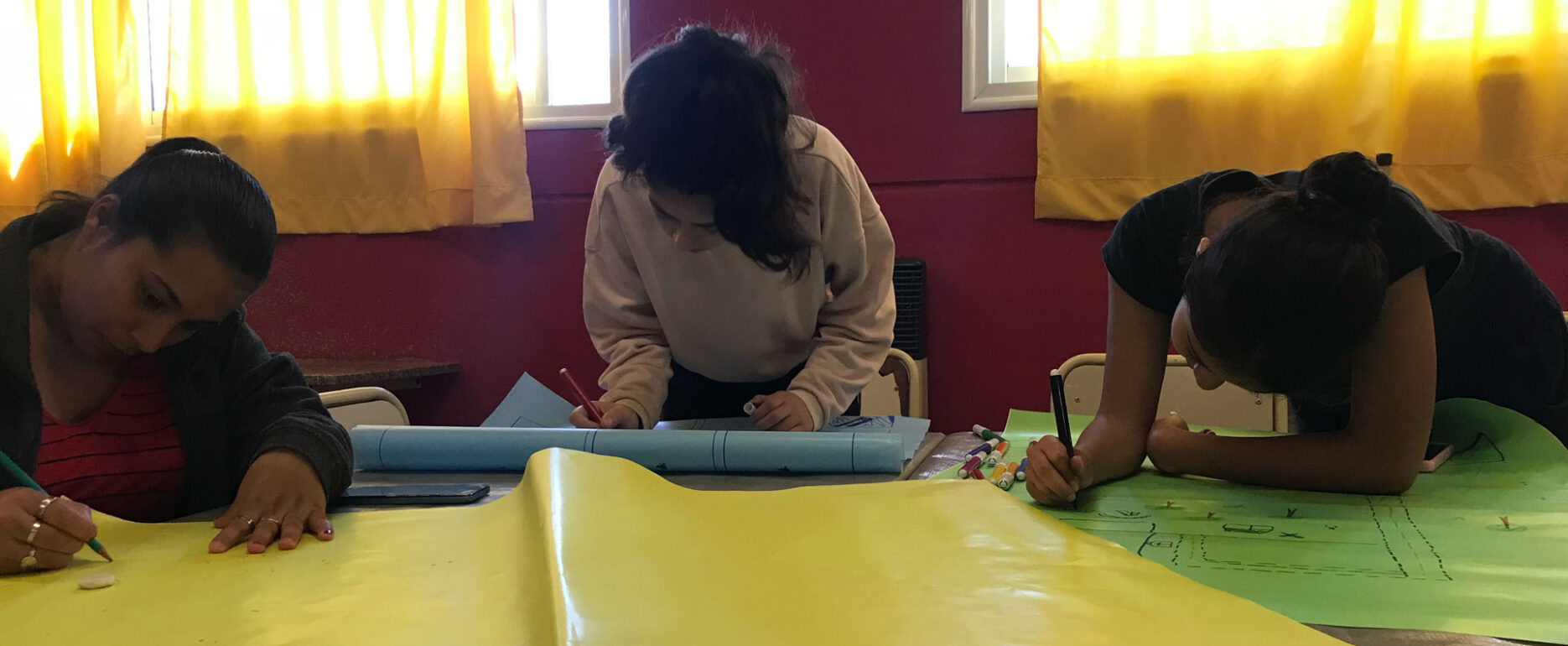 A este encuentro se suma Uma, una adolescente de 14 años que llega acompañada de su mamá. Su mamá pregunta a qué hora la tiene que buscar. Las tres jóvenes que participan del taller fueron a escuelas fuera del barrio, salvo Angi que cursaba cuarto año cuando quedó embarazada y dejó la escuela, y terminó finalizando el secundario en el CENMA el año pasado. Entre las tres, cada una en una hoja grande, se ponen a dibujar.